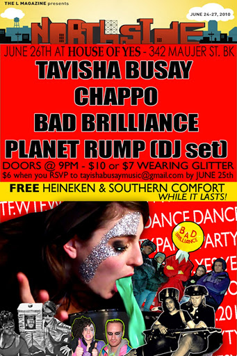 The L Magazine’s Northside Festival has made a brave and very smart move by welcoming the House of Yes and Tayisha Busay as they present a night of the brightest, baddest, chrome-covered, high-bouncing music and righteous showmanship that you can only find in the bottom of a Lucky Charms box, OR at this show. Bands that have fun? Is this really Williamsburg? The night will prove itself to be the most unique and powerful show in the festival. Line-up includes: